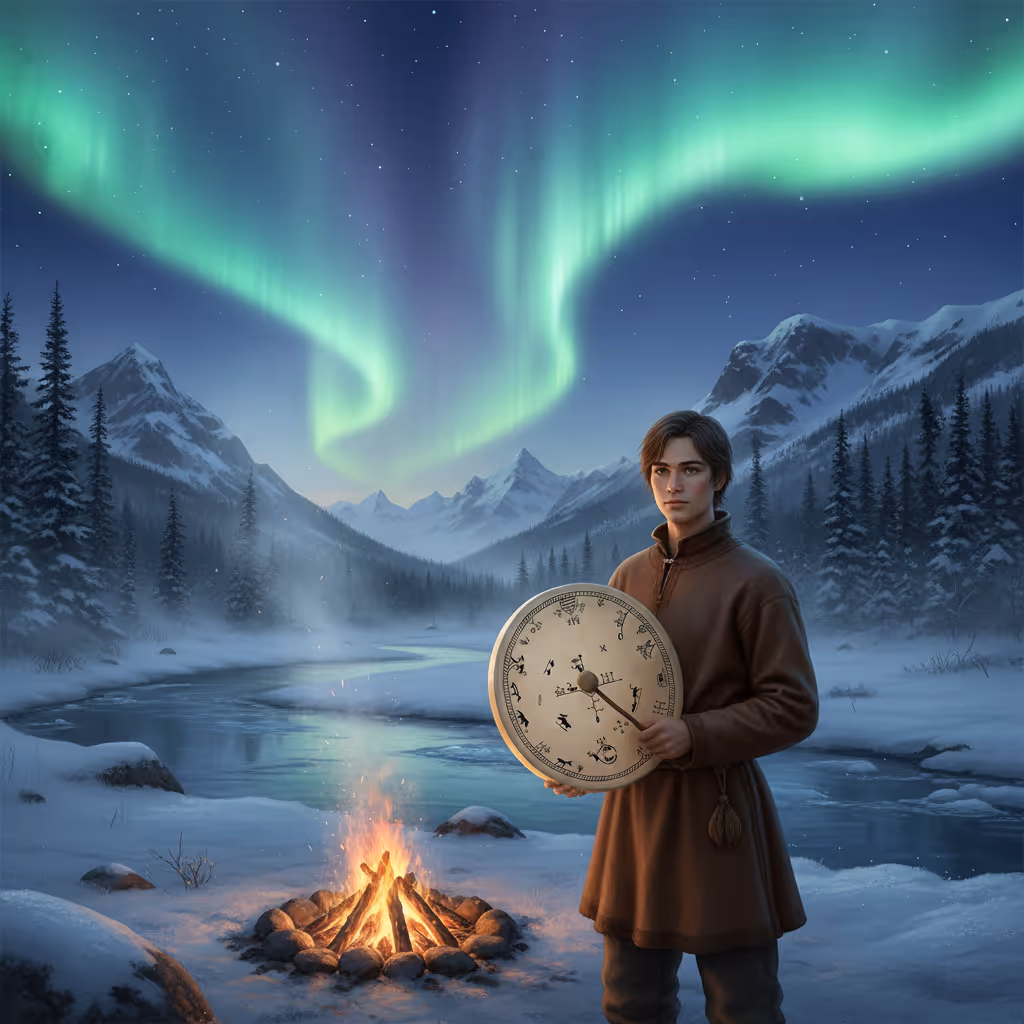 «Din tromme banker med ærlige rytmer,» sa hun og smilte varmt. «Må du lære å stille deg mellom spirene og høsten, og høre nordlysets sang før du går videre.»