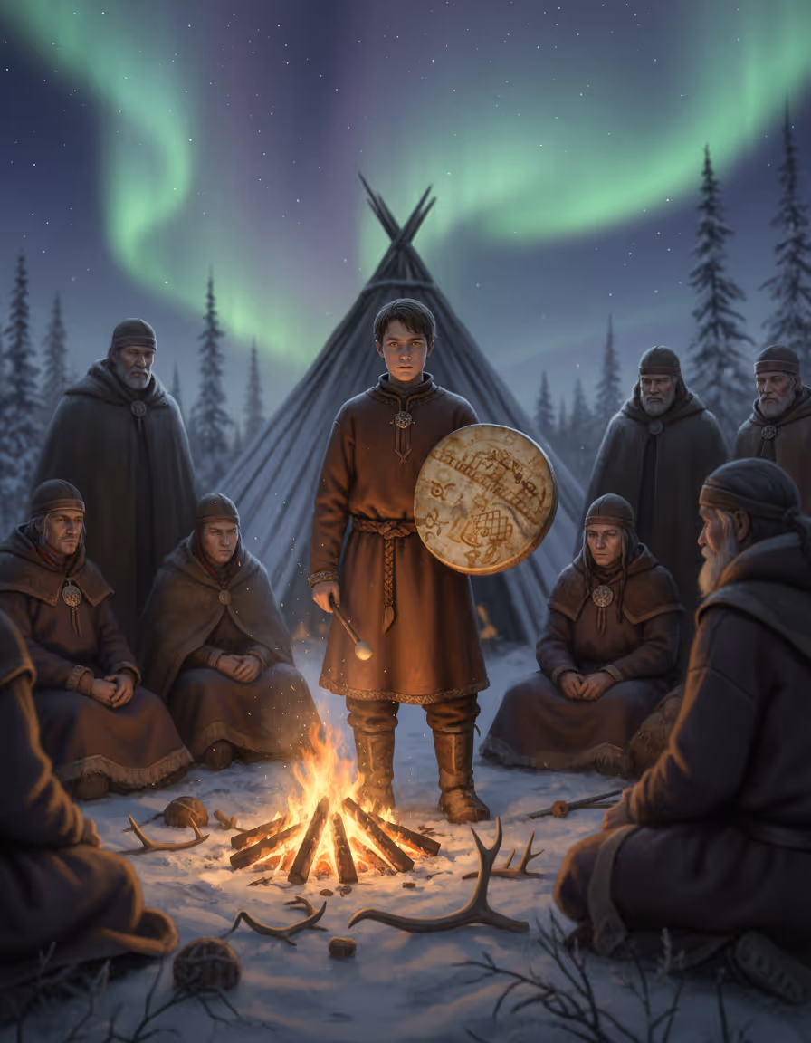 Den brennende flammen fra leirbålet kastet lange skygger mellom trærne. Áilu satt sammenkrøket mot kulden, trommen hvilte ved siden av ham, tung og trygg som alltid. Den blendende nordlysstrømmen danset over himmelen, som en urokkelig vokter av nattens hemmeligheter, men langt inne i skogens hjerte blomstret et annet metaskepsisets mørke.